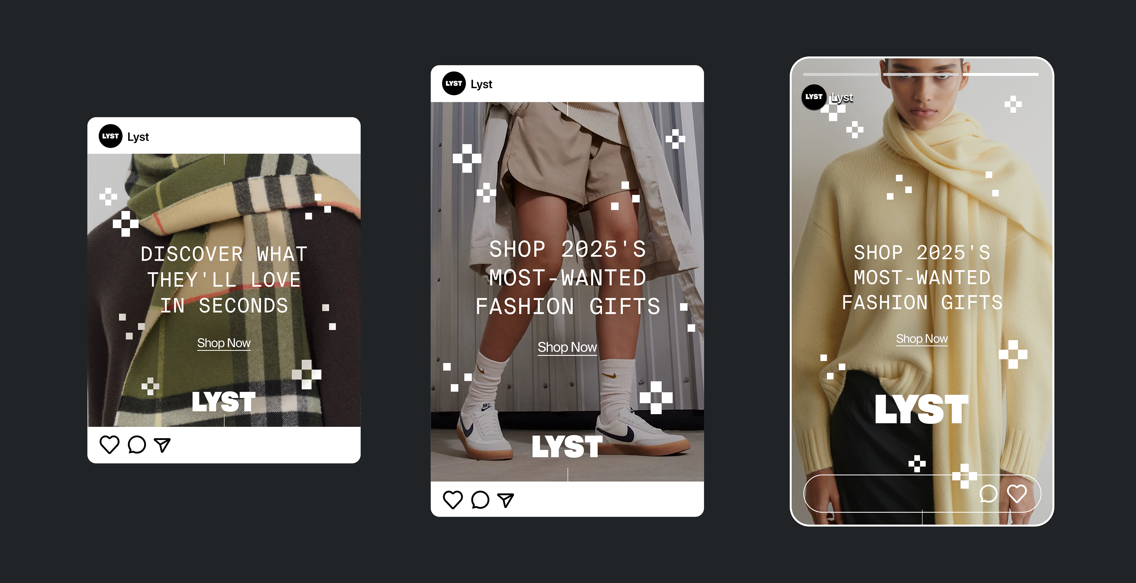 Above: A selection of my Holiday graphical treatment explorations, incorporating a holiday feel that stayed true to the Lyst brand.